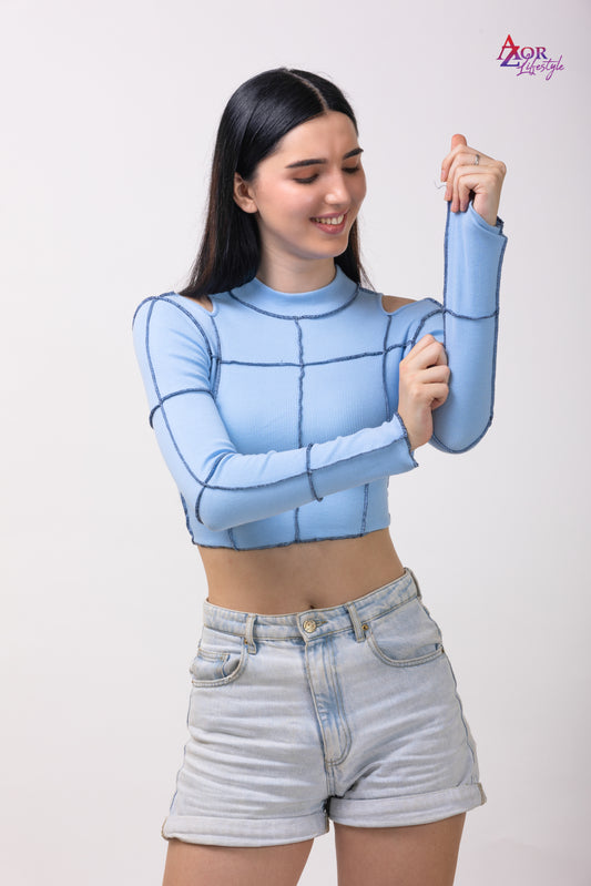 Women blue stitch cut-out crop top