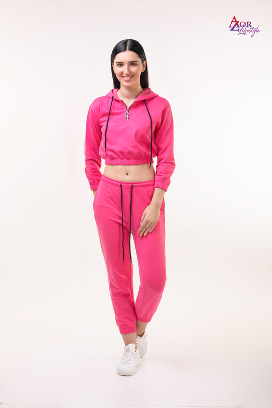 Women pink cotton fleece zipper sweatshirt co-ord set
