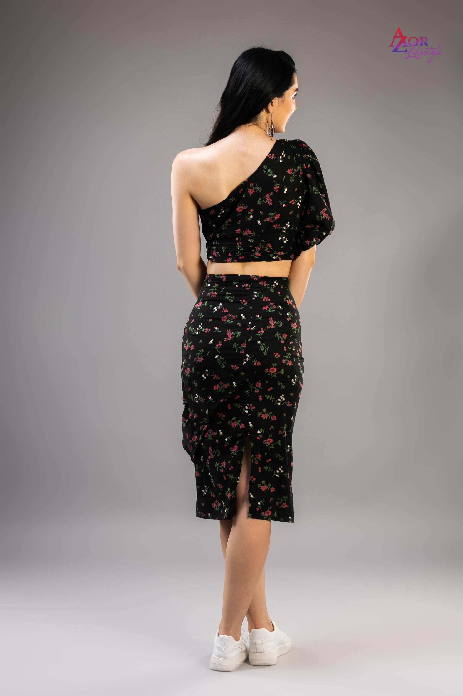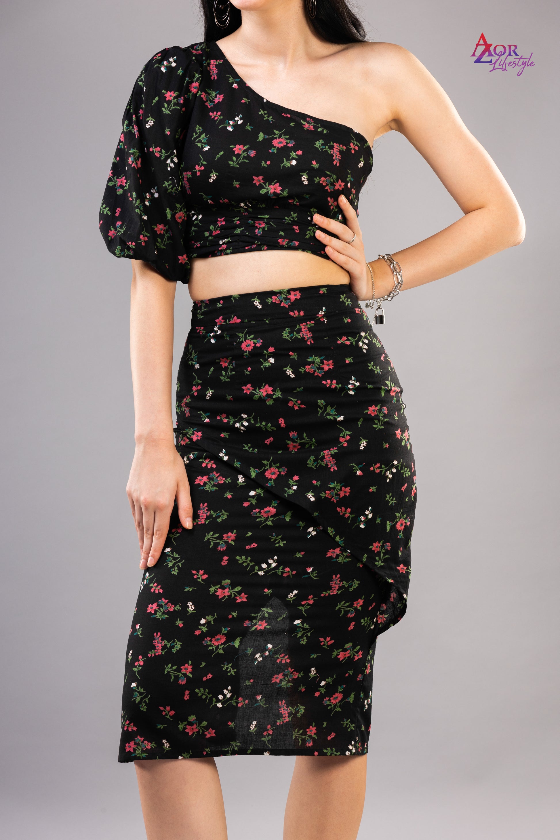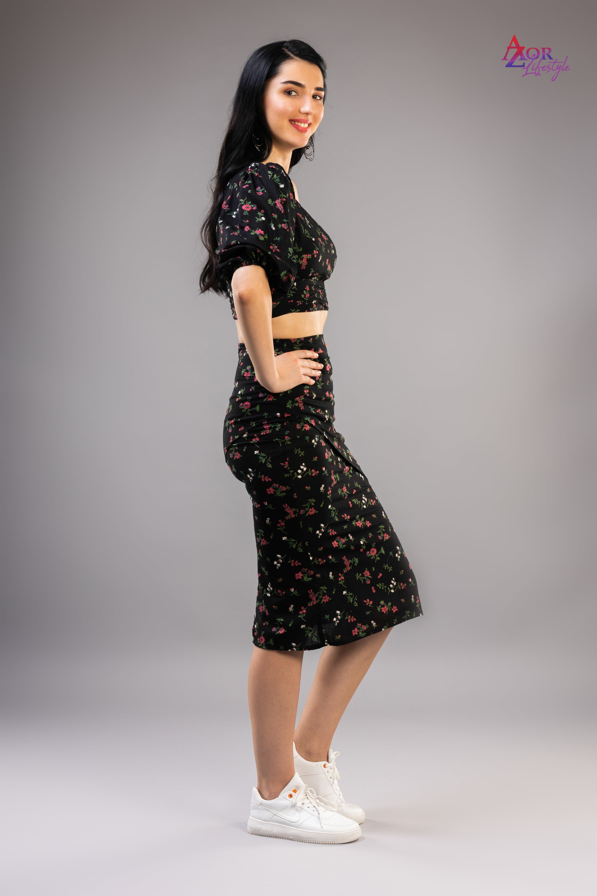 Women black floral cotton co-ord set dress with top and knee length layer skirt