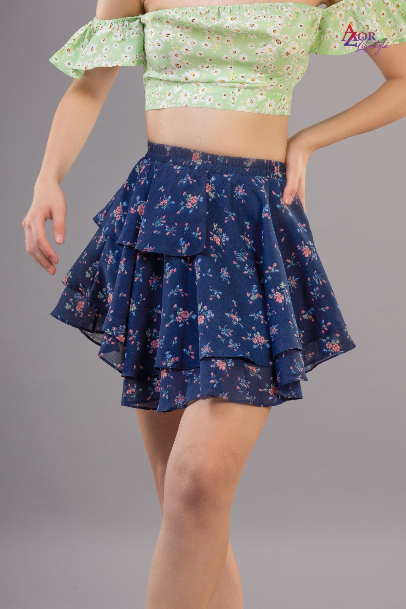 Women blue floral print poly crepe polyster asymmetric layered short flared Skirt